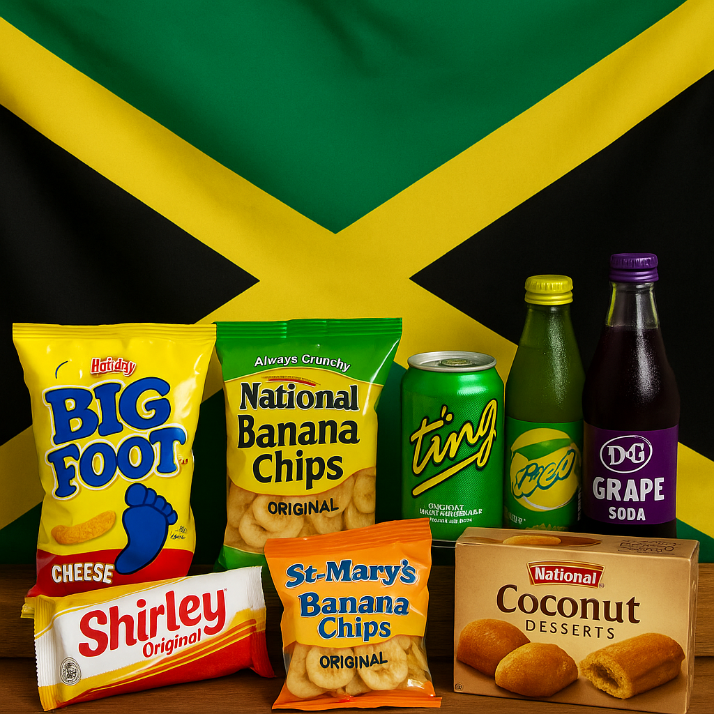 Variety of snacks and beverages in front of a Jamaican flag, including chips, cookies, soda, and a juice box.